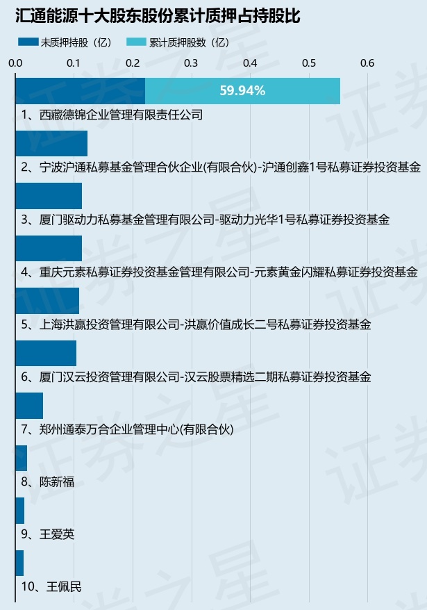 截止本公告日,股东西藏德锦企业管理有限责任公司已累计质押股份3315.0万股,占其持股总数的59.94%。本次质押后汇通能源十大股东的累计质押股份占持股比例(占持股比例的计算以公司最新一期财务报表公布的十大股东的持股总数为基准)见下图: