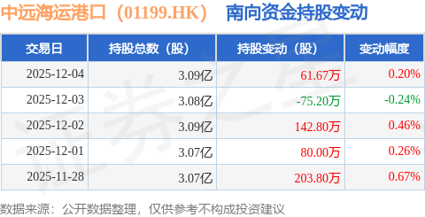 证券之星消息,12月4日南向资金增持61.67万股中远海运港口(01199.HK)。近5个交易日中,获南向资金增持的有4天,累计净增持413.07万股。近20个交易日中,获南向资金增持的有17天,累计净增持1758.94万股。截至目前,南向资金持有中远海运港口(01199.HK)3.09亿股,占公司已发行普通股的7.78%。