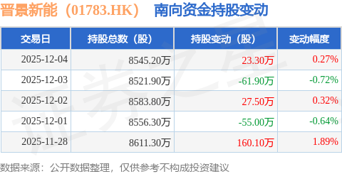 证券之星消息,12月4日南向资金增持23.3万股晋景新能(01783.HK)。近5个交易日中,获南向资金增持的有3天,累计净增持94.0万股。近20个交易日中,获南向资金增持的有10天,累计净增持271.5万股。截至目前,南向资金持有晋景新能(01783.HK)8545.2万股,占公司已发行普通股的2.98%。