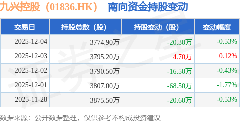 证券之星消息,12月4日南向资金减持20.3万股九兴控股(01836.HK)。近5个交易日中,获南向资金减持的有4天,累计净减持121.2万股。近20个交易日中,获南向资金减持的有13天,累计净减持206.5万股。截至目前,南向资金持有九兴控股(01836.HK)3774.9万股,占公司已发行普通股的4.48%。