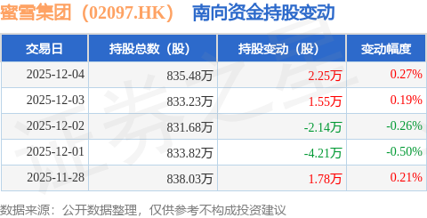 证券之星消息,12月4日南向资金增持2.25万股蜜雪集团(02097.HK)。近5个交易日中,获南向资金减持的有2天,累计净减持7700.0股。近20个交易日中,获南向资金减持的有11天,累计净减持16.2万股。截至目前,南向资金持有蜜雪集团(02097.HK)835.48万股,占公司已发行普通股的5.53%。