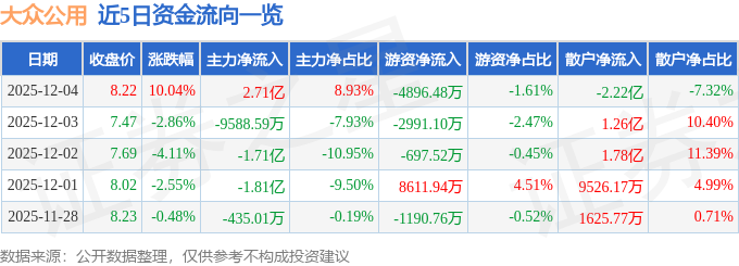 证券之星消息,截至2025年12月4日收盘,大众公用(600635)报收于8.22元,上涨10.04%,涨停,换手率15.67%,成交量379.03万手,成交额30.34亿元。