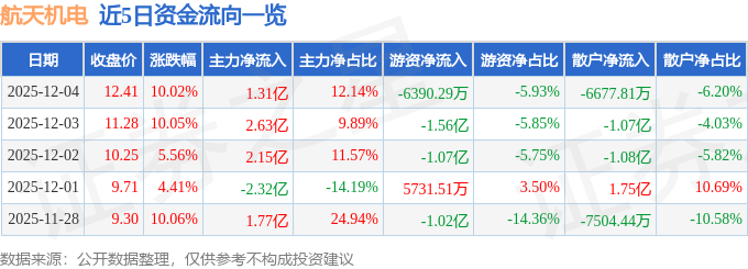 证券之星消息,截至2025年12月4日收盘,航天机电(600151)报收于12.41元,上涨10.02%,已连续涨停2天,换手率6.21%,成交量89.11万手,成交额10.77亿元。