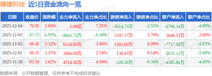 证券之星消息,截至2025年12月4日收盘,臻镭科技(688270)报收于70.95元,上涨5.69%,换手率9.47%,成交量20.28万手,成交额14.17亿元。
