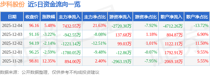 证券之星消息,截至2025年12月4日收盘,步科股份(688160)报收于96.16元,上涨5.48%,换手率4.3%,成交量3.61万手,成交额3.44亿元。