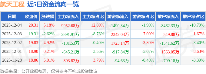 证券之星消息,截至2025年12月4日收盘,航天工程(603698)报收于20.31元,上涨5.18%,换手率7.11%,成交量38.12万手,成交额7.84亿元。