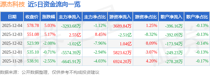证券之星消息,截至2025年12月4日收盘,源杰科技(688498)报收于578.78元,上涨5.03%,换手率8.66%,成交量5.21万手,成交额29.5亿元。