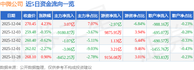 证券之星消息,截至2025年12月4日收盘,中微公司(688012)报收于270.45元,上涨4.23%,换手率2.6%,成交量16.27万手,成交额43.43亿元。