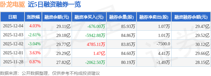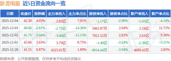 证券之星消息,截至2025年12月4日收盘,卧龙电驱(600580)报收于42.3元,上涨4.03%,换手率6.11%,成交量95.48万手,成交额40.22亿元。