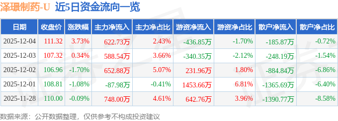 证券之星消息,截至2025年12月4日收盘,泽璟制药(688266)报收于111.32元,上涨3.73%,换手率0.87%,成交量2.3万手,成交额2.57亿元。
