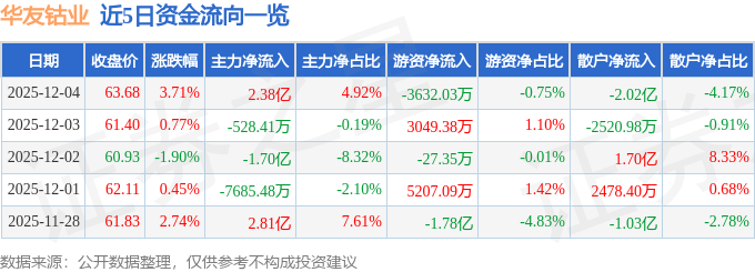 证券之星消息,截至2025年12月4日收盘,华友钴业(603799)报收于63.68元,上涨3.71%,换手率4.05%,成交量76.24万手,成交额48.33亿元。