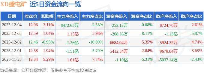 证券之星消息,截至2025年12月4日收盘,XD盛屯矿(600711)报收于12.93元,上涨3.11%,换手率8.23%,成交量254.36万手,成交额33.48亿元。