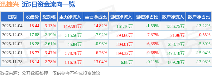 证券之星消息,截至2025年12月4日收盘,迅捷兴(688655)报收于18.44元,上涨3.13%,换手率4.08%,成交量5.45万手,成交额1.01亿元。
