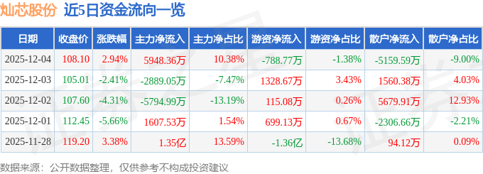 证券之星消息,截至2025年12月4日收盘,灿芯股份(688691)报收于108.1元,上涨2.94%,换手率7.61%,成交量5.44万手,成交额5.73亿元。