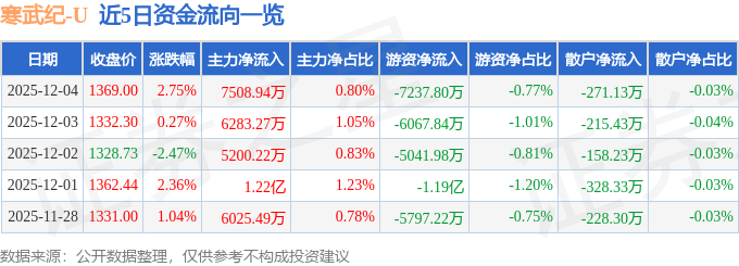 证券之星消息,截至2025年12月4日收盘,寒武纪(688256)报收于1369.0元,上涨2.75%,换手率1.69%,成交量7.05万手,成交额94.14亿元。