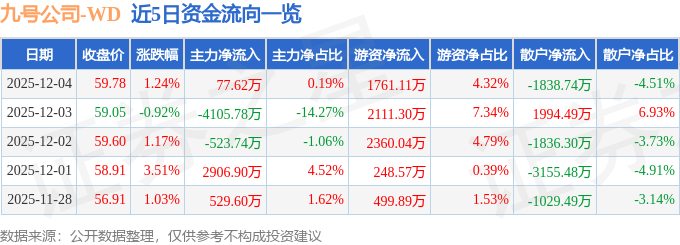 证券之星消息,截至2025年12月4日收盘,九号公司(689009)报收于59.78元,上涨1.24%,换手率1.23%,成交量6.81万手,成交额4.08亿元。