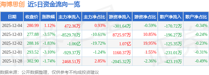 证券之星消息,截至2025年12月4日收盘,海博思创(688411)报收于280.99元,上涨1.12%,换手率4.8%,成交量1.82万手,成交额5.07亿元。
