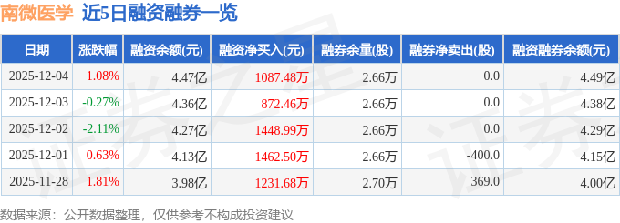 南微医学融资融券信息显示,融资方面,当日融资买入1948.37万元,融资偿还860.89万元,融资净买入1087.48万元,连续3日净买入累计3408.93万元。融券方面,融券卖出0.0股,融券偿还0.0股,融券余量2.66万股,融券余额208.98万元。融资融券余额4.49亿元。