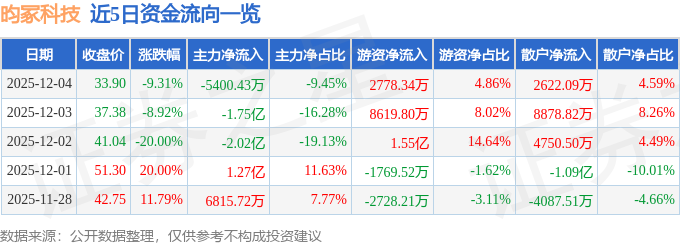 证券之星消息,截至2025年12月4日收盘,昀冢科技(688260)报收于33.9元,下跌9.31%,换手率13.77%,成交量16.52万手,成交额5.72亿元。
