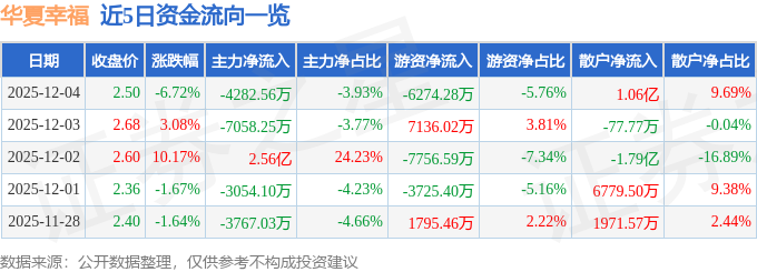 证券之星消息,截至2025年12月4日收盘,华夏幸福(600340)报收于2.5元,下跌6.72%,换手率10.92%,成交量425.11万手,成交额10.9亿元。