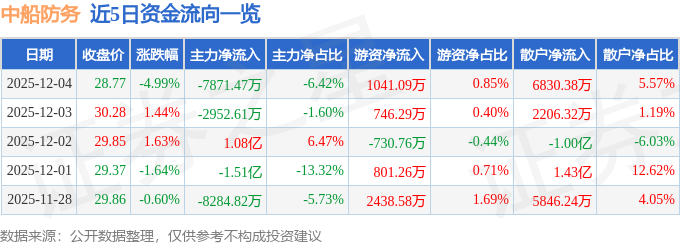 证券之星消息,截至2025年12月4日收盘,中船防务(600685)报收于28.77元,下跌4.99%,换手率5.12%,成交量42.09万手,成交额12.27亿元。