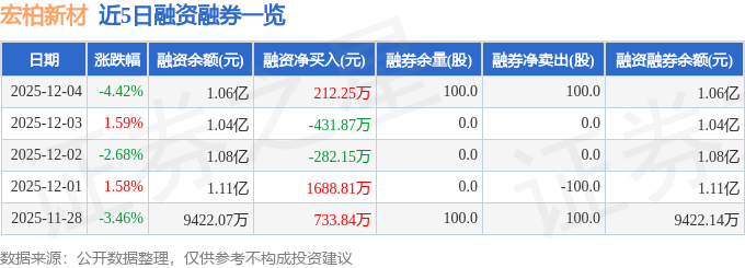 宏柏新材融资融券信息显示,融资方面,当日融资买入1875.94万元,融资偿还1663.69万元,融资净买入212.25万元。融券方面,融券卖出100.0股,融券偿还0.0股,融券余量100.0股,融券余额0.07万元。融资融券余额1.06亿元。