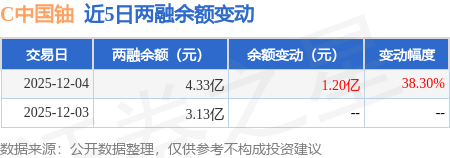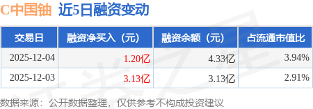 证券之星消息,12月4日,C中国铀(001280)融资买入4.24亿元,融资偿还3.04亿元,融资净买入1.2亿元,融资余额4.33亿元,当日融资净买入排名第10。