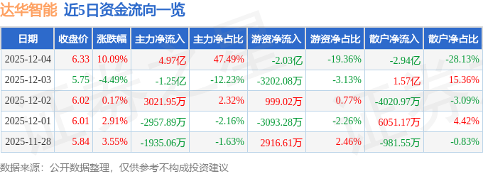 证券之星消息,截至2025年12月4日收盘,达华智能(002512)报收于6.33元,上涨10.09%,涨停,换手率15.45%,成交量169.07万手,成交额10.47亿元。