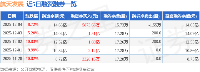 航天发展融资融券信息显示,融资方面,当日融资买入11.15亿元,融资偿还10.56亿元,融资净买入5873.68万元,连续3日净买入累计3.79亿元。融券方面,融券卖出0.0股,融券偿还1.55万股,融券余量15.73万股,融券余额294.15万元。融资融券余额14.65亿元。