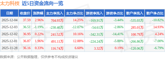 证券之星消息,截至2025年12月4日收盘,太力科技(301595)报收于37.59元,上涨2.96%,换手率5.45%,成交量1.33万手,成交额4945.68万元。