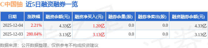 C中国铀融资融券信息显示,融资方面,当日融资买入4.24亿元,融资偿还3.04亿元,融资净买入1.2亿元,净买入额两市排名第12,连续3日净买入累计4.33亿元。融券方面,融券卖出0.0股,融券偿还0.0股,融券余量0.0股,融券余额0.0万元。融资融券余额4.33亿元。