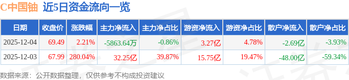 证券之星消息,截至2025年12月4日收盘,C中国铀(001280)报收于69.49元,上涨2.21%,换手率61.18%,成交量96.71万手,成交额68.39亿元。