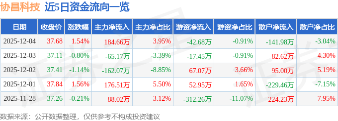 证券之星消息,截至2025年12月4日收盘,协昌科技(301418)报收于37.68元,上涨1.54%,换手率4.26%,成交量1.25万手,成交额4671.06万元。