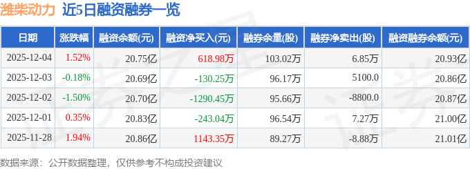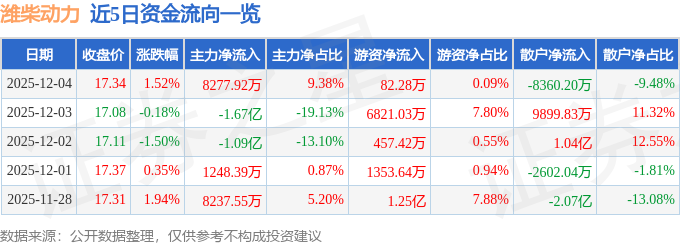 证券之星消息,截至2025年12月4日收盘,潍柴动力(000338)报收于17.34元,上涨1.52%,换手率1.02%,成交量50.97万手,成交额8.82亿元。