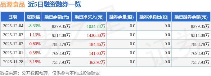 品渥食品融资融券信息显示,融资方面,当日融资买入2011.92万元,融资偿还3046.66万元,融资净偿还1034.74万元。融券方面,融券卖出0.0股,融券偿还0.0股,融券余量0.0股,融券余额0.0万元。融资融券余额8279.35万元。