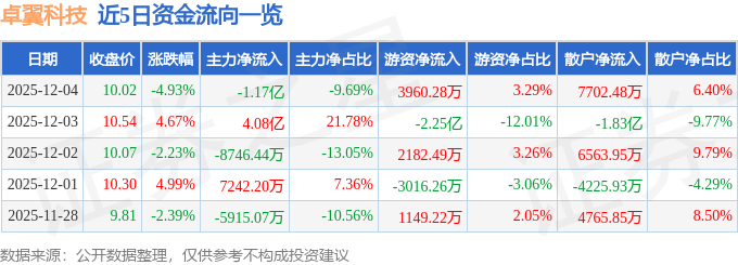 证券之星消息,截至2025年12月4日收盘,卓翼科技(002369)报收于10.02元,下跌4.93%,换手率21.08%,成交量119.37万手,成交额12.03亿元。