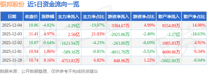 证券之星消息,截至2025年12月4日收盘,银邦股份(300337)报收于10.86元,下跌4.82%,换手率8.65%,成交量61.5万手,成交额6.79亿元。