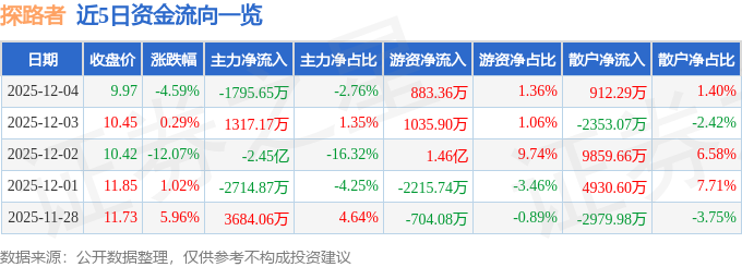 证券之星消息,截至2025年12月4日收盘,探路者(300005)报收于9.97元,下跌4.59%,换手率7.35%,成交量64.91万手,成交额6.51亿元。