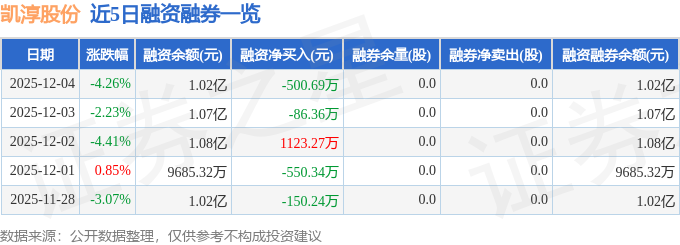 凯淳股份融资融券信息显示,融资方面,当日融资买入1201.36万元,融资偿还1702.05万元,融资净偿还500.69万元。融券方面,融券卖出0.0股,融券偿还0.0股,融券余量0.0股,融券余额0.0万元。融资融券余额1.02亿元。