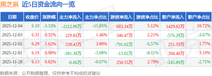 证券之星消息,截至2025年12月4日收盘,黑芝麻(000716)报收于6.1元,下跌3.33%,换手率2.93%,成交量21.65万手,成交额1.33亿元。
