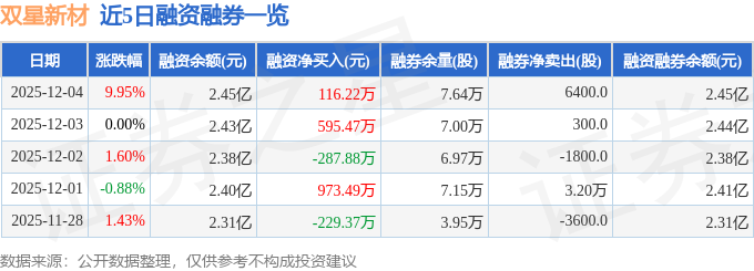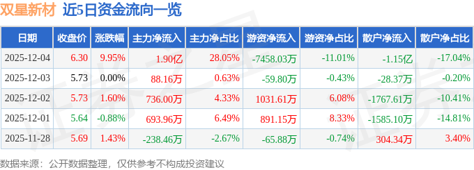 证券之星消息,截至2025年12月4日收盘,双星新材(002585)报收于6.3元,上涨9.95%,涨停,换手率12.44%,成交量110.3万手,成交额6.77亿元。