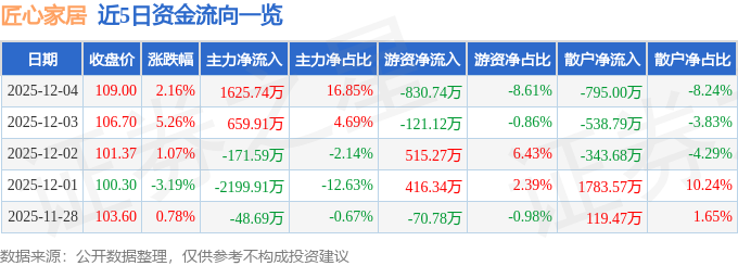 证券之星消息,截至2025年12月4日收盘,匠心家居(301061)报收于109.0元,上涨2.16%,换手率0.62%,成交量8968.0手,成交额9649.08万元。