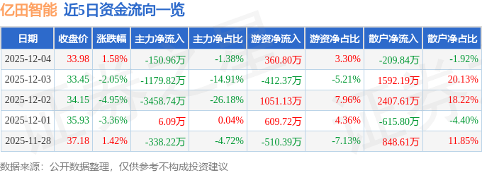 证券之星消息,截至2025年12月4日收盘,亿田智能(300911)报收于33.98元,上涨1.58%,换手率1.89%,成交量3.24万手,成交额1.09亿元。