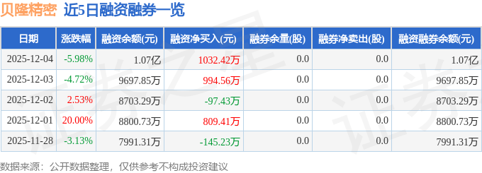 贝隆精密融资融券信息显示,融资方面,当日融资买入4923.86万元,融资偿还3891.44万元,融资净买入1032.42万元。融券方面,融券卖出0.0股,融券偿还0.0股,融券余量0.0股,融券余额0.0万元。融资融券余额1.07亿元。