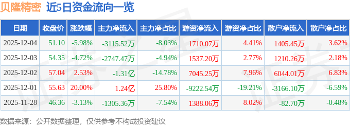 证券之星消息,截至2025年12月4日收盘,贝隆精密(301567)报收于51.1元,下跌5.98%,换手率35.53%,成交量7.55万手,成交额3.88亿元。