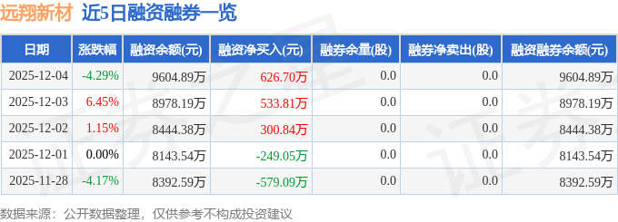 远翔新材融资融券信息显示,融资方面,当日融资买入2279.1万元,融资偿还1652.4万元,融资净买入626.7万元,连续3日净买入累计1461.36万元。融券方面,融券卖出0.0股,融券偿还0.0股,融券余量0.0股,融券余额0.0万元。融资融券余额9604.89万元。