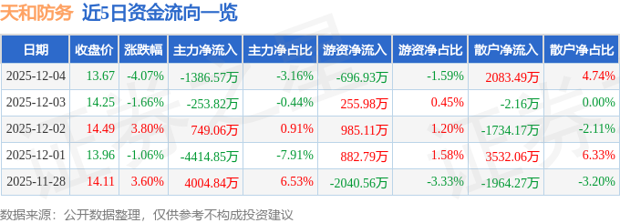 证券之星消息,截至2025年12月4日收盘,天和防务(300397)报收于13.67元,下跌4.07%,换手率7.84%,成交量31.81万手,成交额4.39亿元。