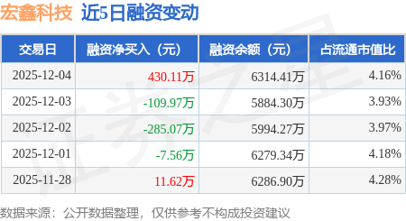 证券之星消息,12月4日,宏鑫科技(301539)融资买入771.43万元,融资偿还341.32万元,融资净买入430.11万元,融资余额6314.41万元。