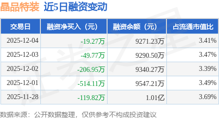 证券之星消息,12月4日,晶品特装(688084)融资买入465.07万元,融资偿还484.34万元,融资净卖出19.27万元,融资余额9271.23万元。