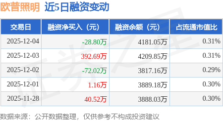 证券之星消息,12月4日,欧普照明(603515)融资买入235.77万元,融资偿还264.57万元,融资净卖出28.8万元,融资余额4181.05万元。